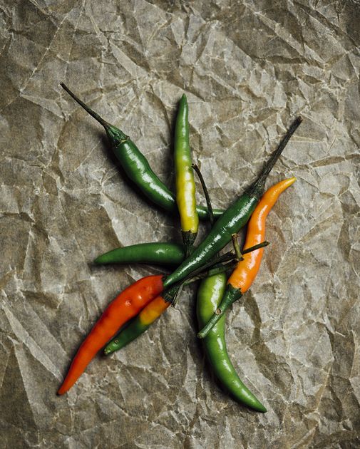 Much smaller than serrano chiles, but much hotter. They come in green and red varieties.