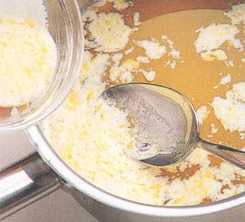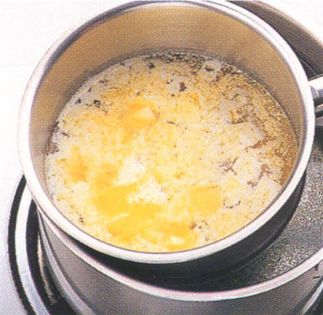 To make 100 g (3 ¼ oz) clarified butter, cut 180 g (5 ¾ oz) butter into small cubes. Place in a small pan set into a larger pot of water over low heat Melt the butter without stirring.