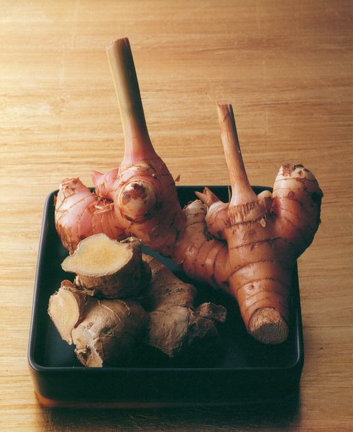 Two types of this rhizome, both members of the ginger family, are available on the market and shouldn’t be confused. Greater galangal, native to Java and Malaysia and resembling ginger in appearance, has pinkish red skin with creamy white flesh, a dense texture and a gingery lemon flavour. Lesser galangal, a smaller rhizome with a more pungent, peppery aroma and fibrous texture, originated in southern China and is used predominantly in that country for its medicinal properties. (Greater galangal is also used medicinally to cure nausea and stomach ailments and to fight bacteria.)