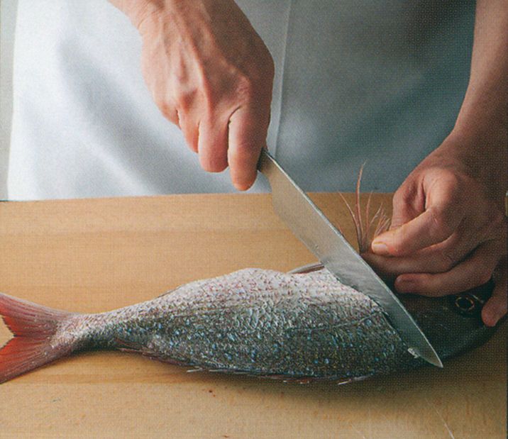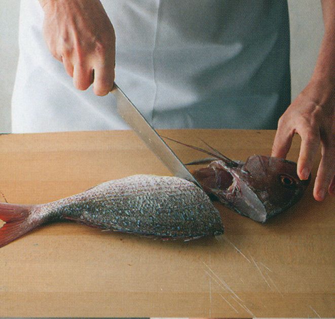 Lift up the side fin and, using a cook’s knife, cut at an angle just below the head.