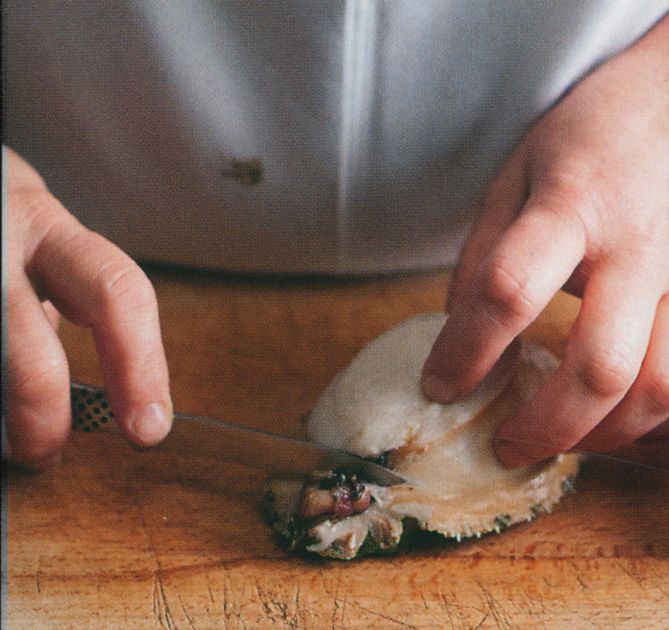 Cut a thin layer off the surface of the abalone foot (where it attached to the rock). Discard.