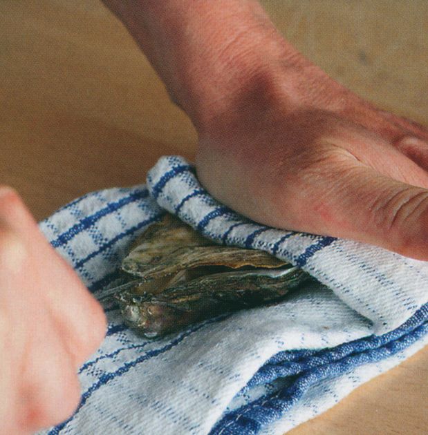 Rinse the oysters under cold water to remove any excess dirt. Fold a tea towel around the wide end of the oyster shell and rest it on a chopping board, flat-side up, with the narrow end pointing out.