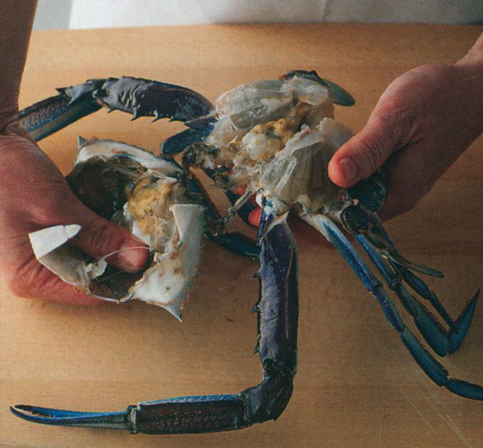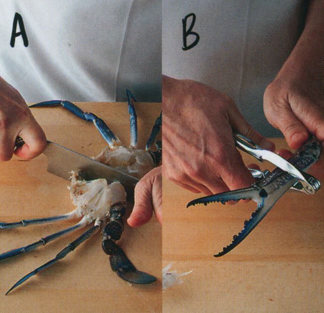 - (A) Quarter the body. (B) Crack the large legs and nippers with crab crackers (see Seafood kit) so the flavours and heat can penetrate.