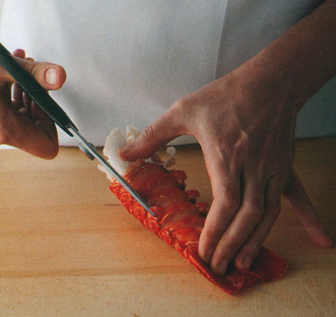 Lay the tail on a chopping board on its back and press gently to flatten. Cut down both sides of the underside of the tail shell using kitchen scissors.