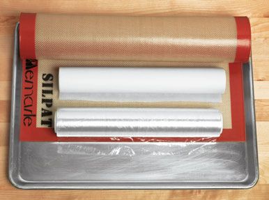 Sheet pan, silpat liner, parchment paper, and plastic film