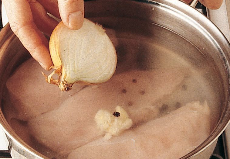 Place the meat and any flavourings in a pan and add just enough water to cover. Bring to the boil, then remove from the heat and leave to stand, covered, for 10 minutes, then drain.