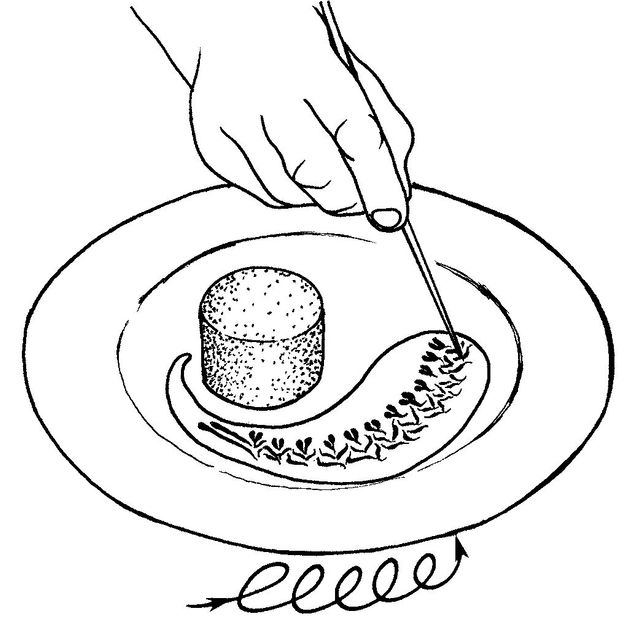 3. Drag a small wooden skewer up and down through the pattern without picking it up, dragging through both the dots and the solid lines when moving toward the edge of the plate and through the solid lines between each dot when moving toward the dessert (Figure 13-14).