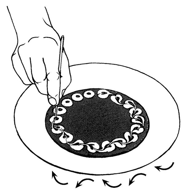 Drag a small wooden skewer in a curved side-to-side pattern through the center of the small dots, moving all the way around the plate in one continuous line (Figure 13-16). Place the dessert in the center of the plate.