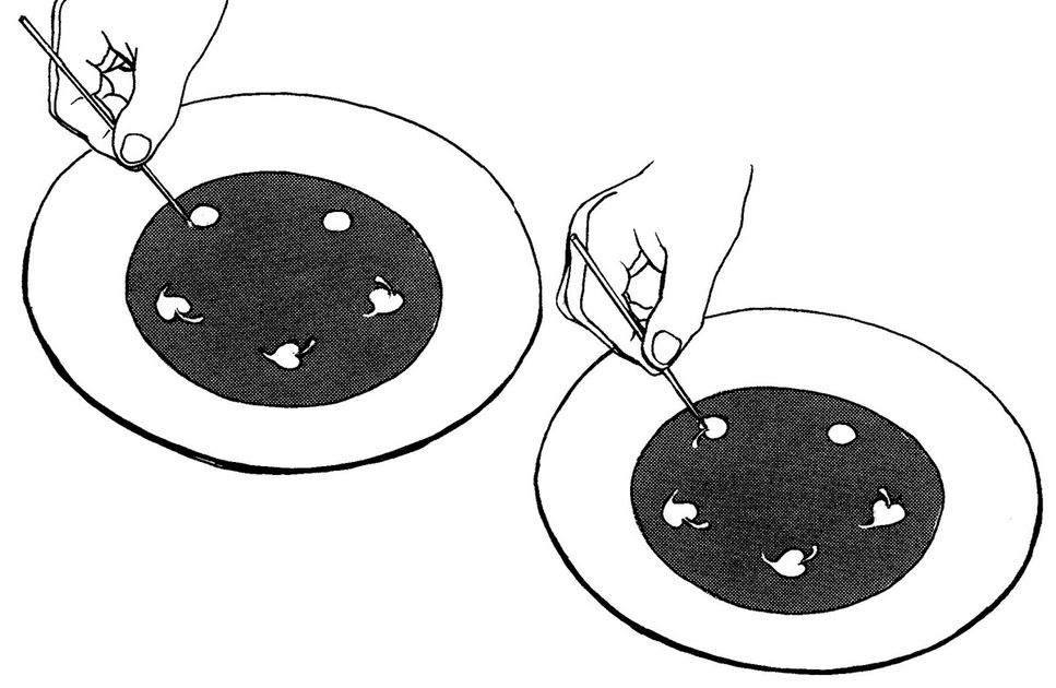 Dip the tip of a small wooden skewer into one of the dots of contrasting sauce to pick up a little bit on the skewer. Place the tip of the skewer in the sauce on the plate about ½ inch (1.2 cm) away from the dot, then drag it through the dot and out the other side in a slightly curved motion, creating a heart with a stem (Figure 13-17). Repeat with the remaining dots. Place the dessert in the center of the plate.