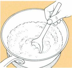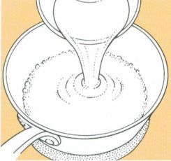Cook over a very gentle heat, stirring the cooked eggs from the sides of the pan into the liquid egg in the middle. (For softly ’set’ eggs, don’t stir too much.)