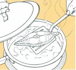 Place the fish in barely simmering, just trembling, liquid to cover in a shallow pan that holds the fish in a single layer. Cover and poach for 5–10 minutes, depending on the thickness of the fish.