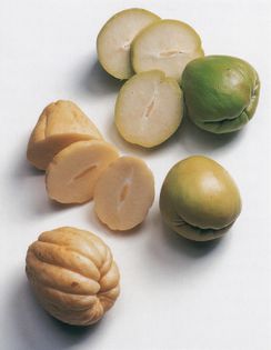Chayote, like many members of the rambling Cucurbitaceae (gourd family) is known more for its usefulness than its distinctiveness. This versatile, mild-mannered player fits roles from soup through dessert. Its pale flesh is crisp and fine-textured, with a taste and consistency that meld cucumber, zucchini, and a hint of kohlrabi. Roughly the shape and size of a pear, with uneven furrows running its length, chayote may be pale apple-green (the most common form found in the United States), cream, or ivy. It usually has fairly smooth skin but may display a hedgehog array of prickles (not sharp). Those available here generally weigh about ¾ pound.