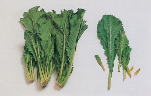 This mustard is called red-in-snow in books on Chinese food; thus one can only wonder at the blatant greenness of the loosely bunched, sharply serrated leaves, which resemble (but are not) a mizuna-dandelion cross. In