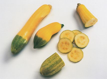 Zephyr, a newcomer that has a yellow crookneck as one of its parents, is a hybrid from Johnny’s Selected Seeds. Its other parent was derived from a Delicata and yellow Acorn cross. Unfortunately, all of my samples (including the one in the photo) were picked larger than the size recommended by the developers, so I cannot properly evaluate the product. I can report only that its colors baked to a shiny, deeper brilliance, that it was quite crisp (in fact, brittle), and that it was somewhat sweet but lacked flavor. It seems highly unlikely that a squash with Delicata and yellow crookneck in the mix could be anything less than delightful, so I recommend that you try it for yourself if you find it.