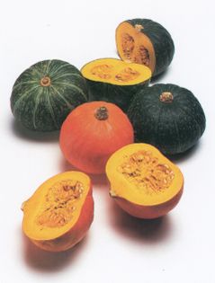 Kabocha types (Cucurbita maxima and C. moschata) are numerous and confusing. Kabocha is a generic term for winter squash developed in Japan (including Kuri). Unfortunately, it is the sole marketing term used in North America to designate all cultivars (rather like using just the word “apple” for Granny Smith, Golden Delicious, Gala, etc.). There are two primary types: drum-shaped green Hokkaido, usually fairly rough-skinned and mottled or striped darkgreen to slate; and the globular or pointy smoother orange Hokkaido (derived from American Hubbard). And then there are all the others between, which look like either or both—and may even confuse you by having Buttercup-style beanies. What you cannot see is what these Japanese squash have in common: deep flavor, honeyed sweetness, and flesh so fine-grained that it can seem more custard than vegetable.