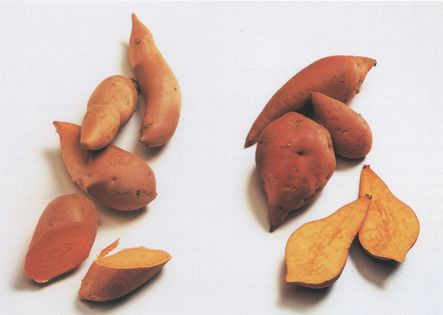 Orange-fleshed sweetpotatoes, such as Beauregard, the primary commercial type, and the smallervolume Jewel and Garnet pictured, are “traditionals” in North American markets. However cooked, they have a soft, sometimes squishy feel in the mouth and a pumpkin flavor. They are always decidedly sweet, but the degree of sweetness “varies with the cultivar, how they are handled after harvest, and the length of time after harvest. As a consequence, sweetness can be quite variable—and a major frustration for consumers”, says Stanley Kays. There are also fairly dry orange-fleshed types, but they seem to have all but disappeared from the market.