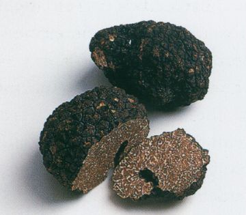 Oregon black truffle (Leucangium carthusianum, formerly Picoa carthusiana) is the only truffle in this group that is not a Tuber species—and this is strange, because it may have more of the inimitable black truffle aroma than some true truffles do. In the ripest specimens, enthusiast Greg Higgins sniffs out pineapple, port, mushrooms, rich soil, and chocolate. My large, crusty samples—irregular coal-like lumps of white-veined cocoa flesh—had hints of these, as well as the mild melanosporum scent. Neatly sliceable, the texture resembled moist Parmesan and ground almonds.