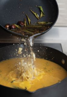 Baghar or Tarka, also called tempering, is a method of seasoning cooked food with spices heated in oil or ghee. This spice-infused oil enhances the flavour of the curry.