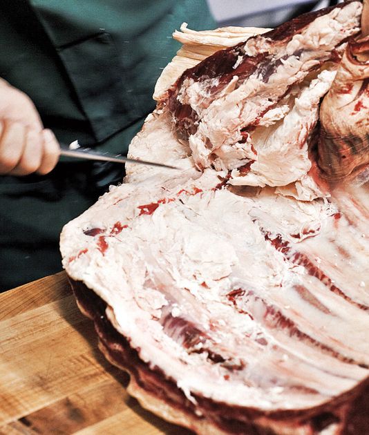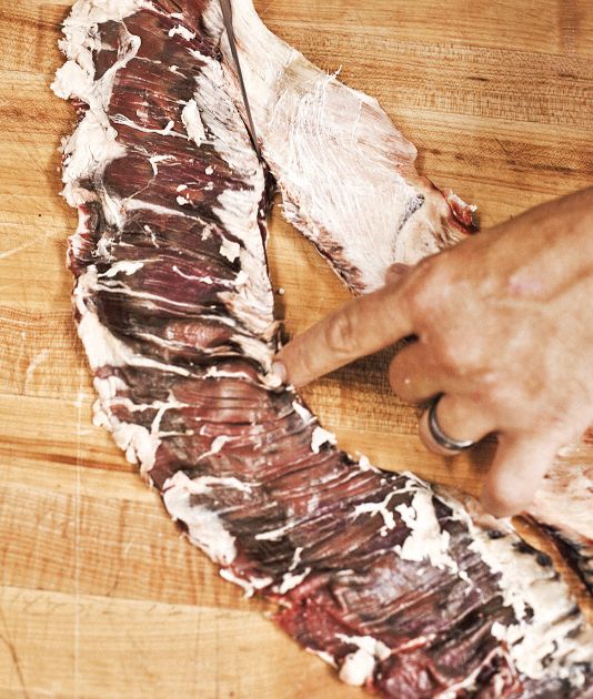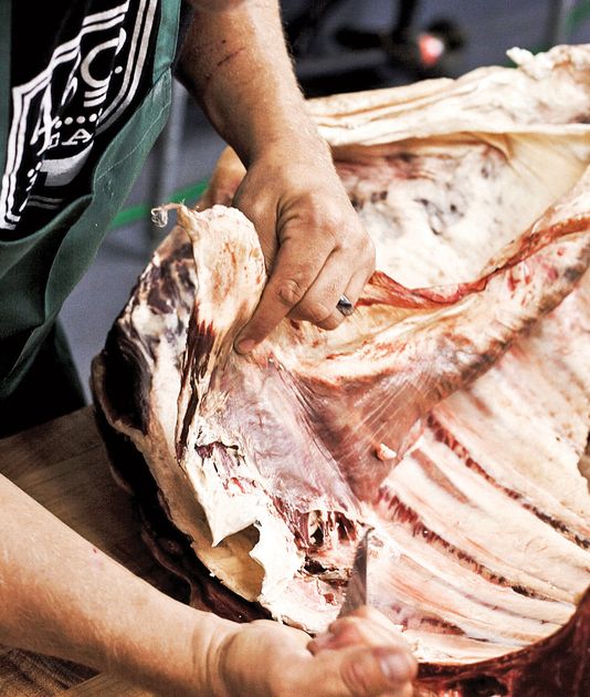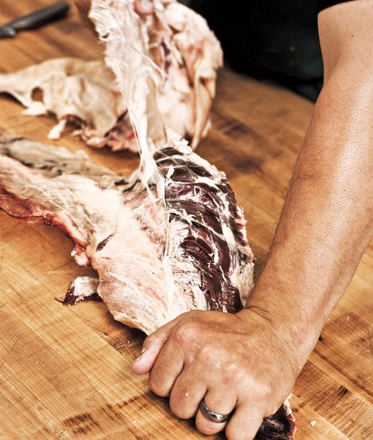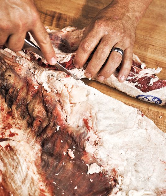 Now, with the rib section that we left hanging, remove the skirt from the inner side of the forequarter.