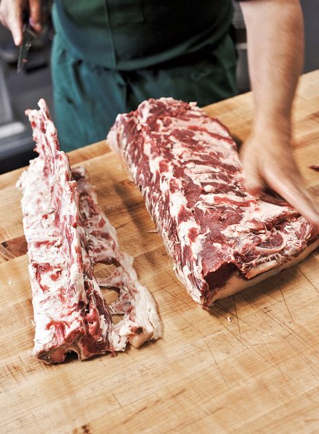 With your knife, cut between the meat and bone to peel back the New York strip from the loin bones.