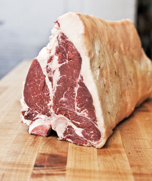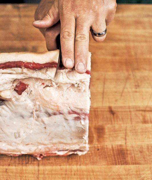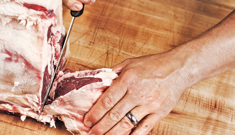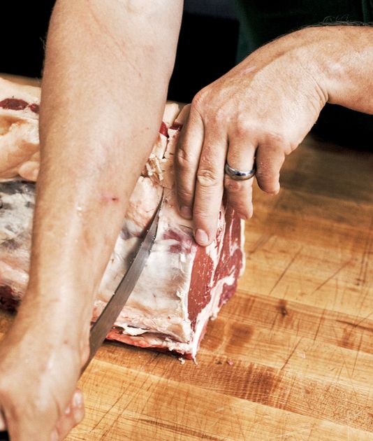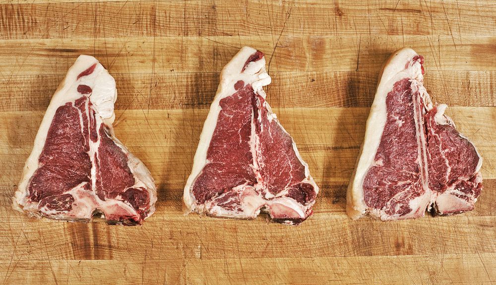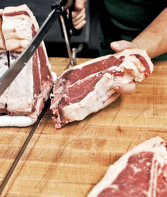 Mark the meat. (I always measure with two fingers, to cut thick, memorable 2-inch/5-centimeter-thicksteaks.)