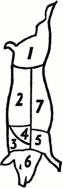 The appearance of the leg (i) and loin (2) are well known. They may be either baked, the leg boiled or in the case of cutlets and chops, fried.