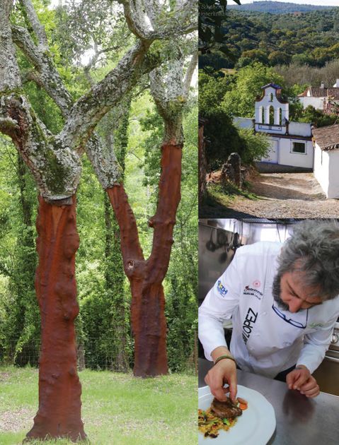 Arrieros is a cool, rustic-chic restaurant that flows outside onto a sunny, flowery terrace. Here, neighbors’ chitchat and church bells vie with a cacophony of hundreds of birds nurtured by the surrounding nature reserve that stretches to the Portuguese border. The verdant woodlands are also famously home to Iberian pigs, which end up as superlative solomillo or jamón ibérico, so it is no surprise that