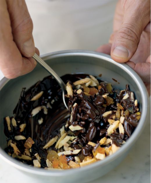 The Ideal Rocher is shaped like a haystack. The individual shapes of the nuts or candied fruit should be clearly visible through the chocolate. Tossing the nuts or fruit with melted cocoa butter before adding the chocolate will act to thin the chocolate and give more definition to the shape of the nuts or fruits.