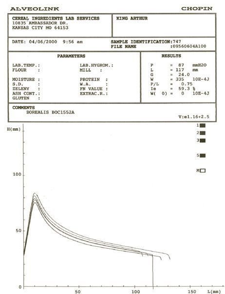 The testing apparatus consists of a mixer, water jacketed to keep the dough at 24°C, that mixes an unyeasted dough for 7 minutes. The dough consists of 125 cubic centimeters of water salinated at 2.5 percent, and 250 grams of flour (this is the standard dough used by the American Association of Cereal Chemists, although in Europe flour and water quantities may be different). A sheeting mechanism extrudes the mixed dough onto a plate, where it is then literally blown into a bubble by air pumped from a diaphragm at a calibrated rate. Last of all, a recording device called a manometer measures the changes the dough bubble undergoes onto a chart. Each flour sample is mixed once, the tests are performed 5 times, and the average value is used to evaluate the flour. The purpose of this somewhat strange setup is to measure the dough’s resistance to rupturing as more and more air is blown into the bubble. Stronger doughs obviously can be blown up more than weaker ones before they pop, and different aspects of the test record various aspects of the dough’s deformation. Taken as a whole, the alveo-graph gives the baker a sense of the balance between the extensibility and elasticity of a dough made with a certain flour. Shows our sample. The figures are as follows: