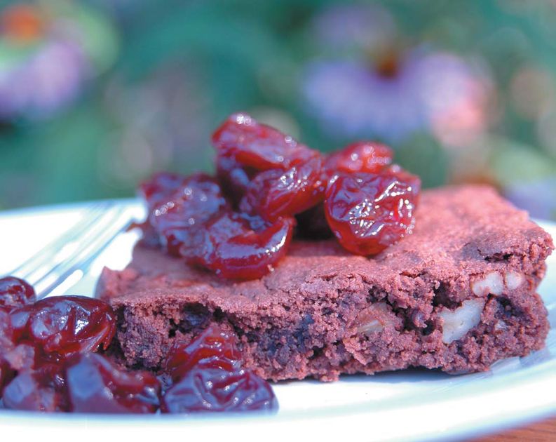 You don’t have to eat this outdoors, surrounded by flowers, but somehow a brownie with Poached Dried Cherries just tastes better that way!