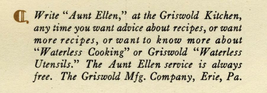 Aunt Ellen was “born” in the 1920s, when Miss M. Etta Moses began fielding letters received at the Griswold Manufacturing Company about the use and care of the brand’s cookware utensils.