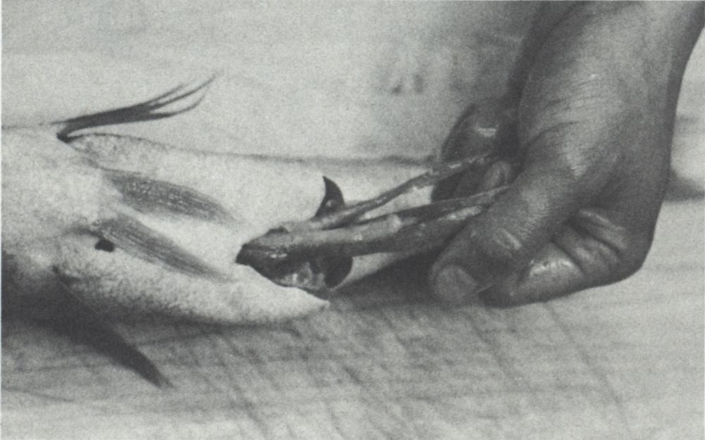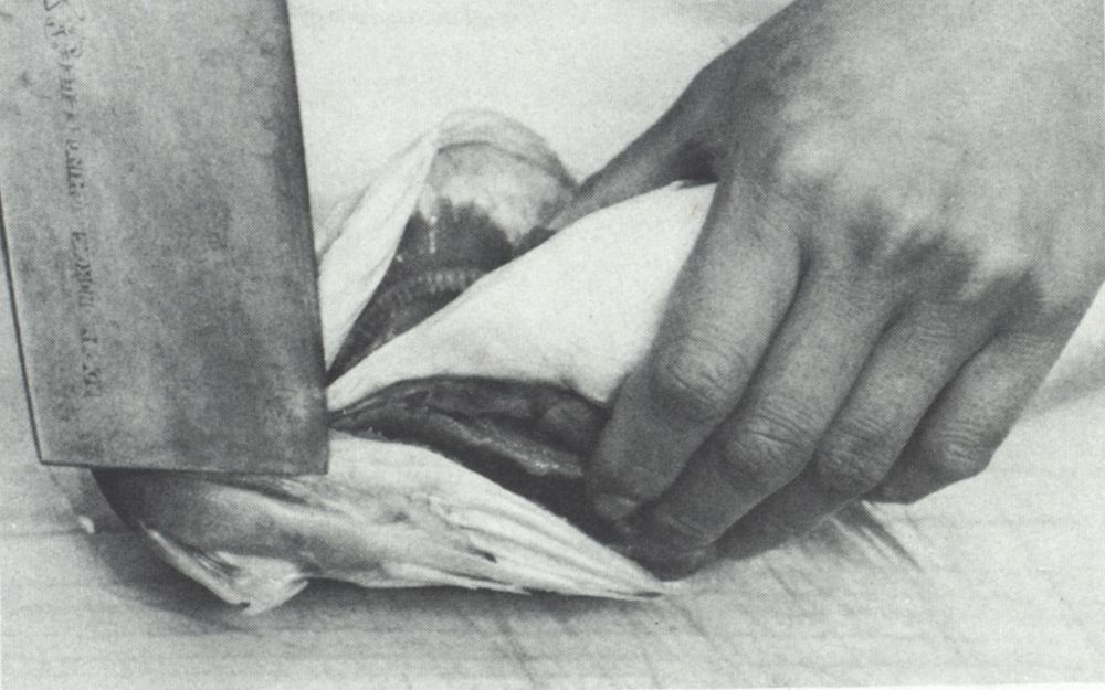 If the cavity of the fish is to be stuffed, the entrails can be pulled out instead through the gill cavity behind the head. In this case, do not make the V-shaped, cut on the belly.