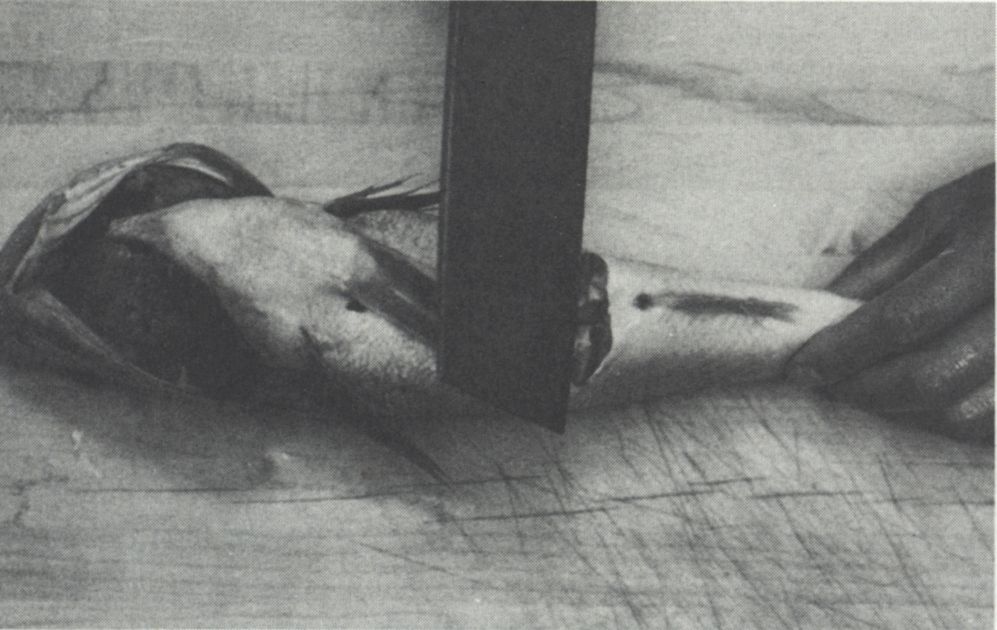 Holding the fish belly up, free the head from the body with a partial cut under the mouth. Leave the head attached at the top so that the “neck” works as a hinge.
