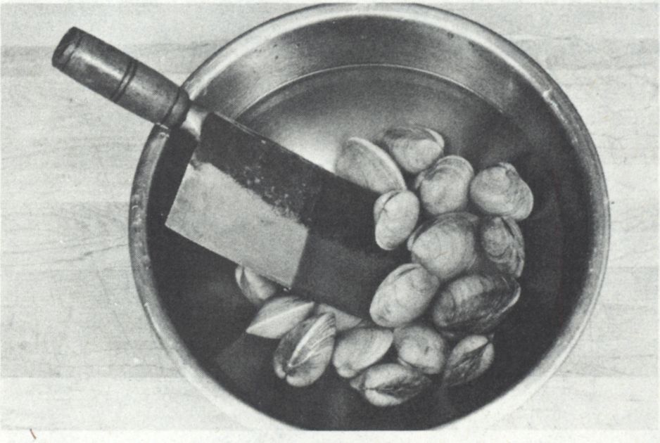 Put the clams in a large bowl and cover them with water. Put a clean cleaver in the water with the clams. The iron in the cleaver causes the clams to spew out any sand and grit that may be inside the shells (this takes about two hours). Drain the clams. (Note the sand at the bottom of the bowl.)