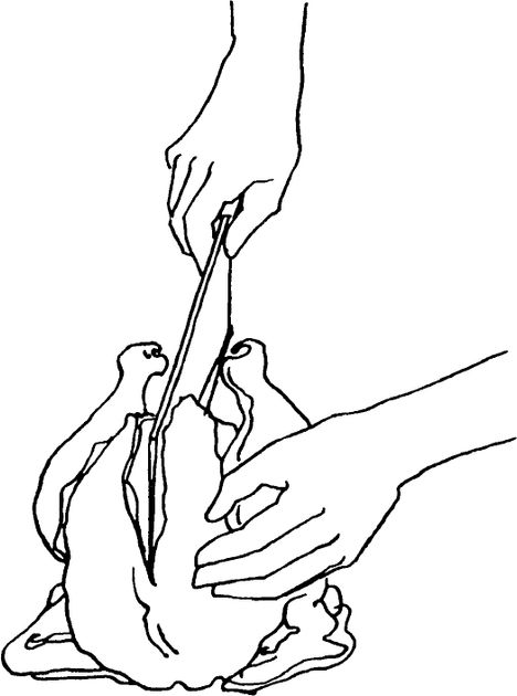 Sit the bird up, its back to you. Using a cleaver, cut downward from the spinal joint.