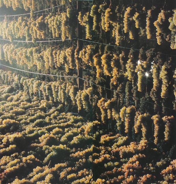 Pan di San Giuseppe, Half-title page: a vegetable stall at Turin market. Title page: The Altesino vines, Montalcino, in late autumn. Right: grapes drying for vin santo in Montalcino.