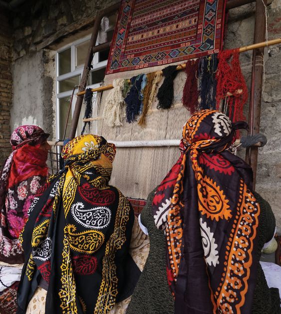 Three women weaving a carpet in a village in eastern Azarbaijan.