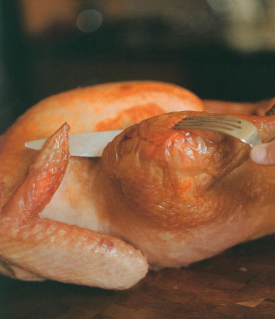 Chicken is truly versatile. Almost any technique can be used to cook it, and because its flavor is relatively neutral, it adapts well to countless flavor combinations. However you prepare chicken and turkey, one secret to success remains: don’t overcook them. Most cooks follow recipes that call for cooking the bird to a temperature of 160°F or higher for fear of salmonella. But in fact, a whole chicken or turkey is done when the innermost part—where the thigh joint lodges in the back—reaches 140°F. The salmonella organism dies at a temperature of 137°F, and since the bacteria is found not in the meat, but only on the surface and in the cavity, both of which become much hotter than 137°F by the time the chicken is cooked to an internal temperature of 140°F, there is no need to overcook the chicken. If you are cooking chicken parts, they are done when the breast and thigh meat bounce back to the touch. When you cut the thigh away from the breast of a roast chicken or turkey, the thigh meat near the joint should still be pink or have red streaks. The meat is only undercooked when it is shiny and translucent looking.