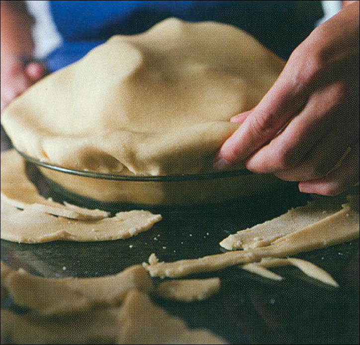 First, tart molds come in different forms. The most popular and easiest to use is a metal pan with a removable bottom. This makes it easy to take the ring off the finished tart and allows you to serve the tart right on the metal base of the tart pan, eliminating the potential hazard of trying to transfer the tart, bottomless, to a serving plate. There are also tart molds made of porcelain, but these are designed for serving the tart directly from the mold and are usually reserved for quiches or country-style savory dishes. The third type is a tart ring, which is a simple metal ring that supports only the sides of the tart. Lining a pie pan is straightforward: simply roll over the dough and press it into the corners and against the walls. Trim off the edges, leaving at least ½ inch of extra dough around the sides to form a fluted edge. If you’re making a pie without a top cover, simply fold under this extra ½ inch of dough and press it between the thumb of one hand and the fingers of another to form a fluted edge (see step 6, “How to an Make Apple Pie,”). If the pie has a cover, simply pinch together the top and bottom crusts to form the fluted edge.
