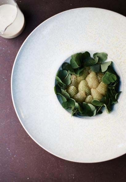 Chamomile & Apple Sorbet, served with Green Strawberries & Wood Sorrel (from Winterspring Dessert)