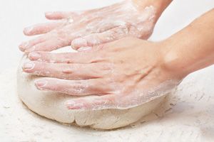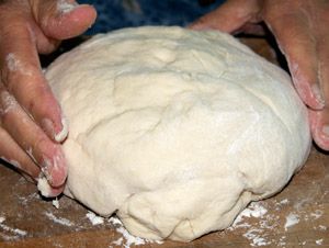 When dough is turned out onto a table or board to be kneaded, shape it into a ball. Use the heels of the hands and push down heavily on the ball, pushing the dough away from you.