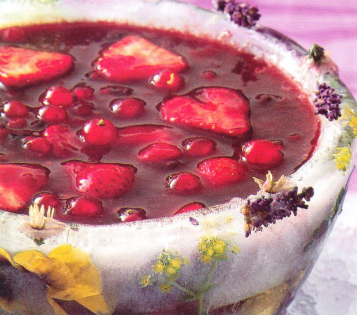 Delicate flowers and leaves suspended in a bowl made of ice make a beautiful container in which to serve fresh fruit, ice creams and sorbets. With care, an ice bowl can be used more than once.