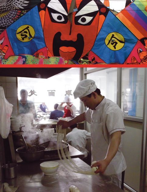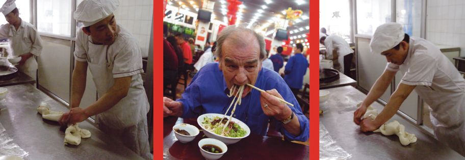 Chefs preparing noodles at a restaurant in Houhai; halfway through a bowl of very good noodles from Old Beijing Zhajiang Noodle King; kneading the noodle dough.