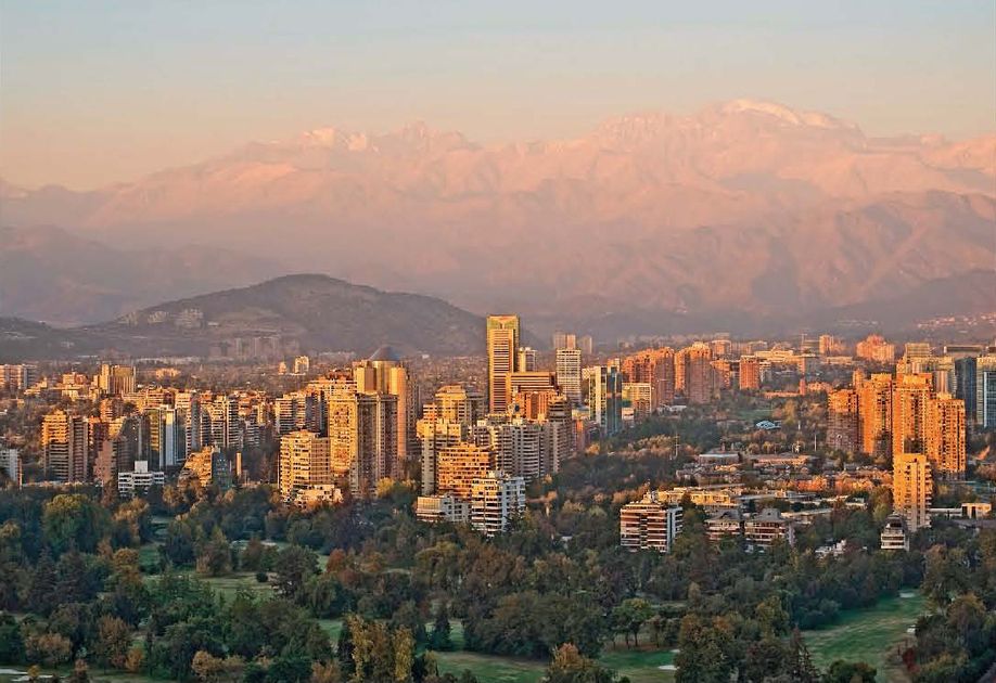 The modern high-rise buildings of the city of Santiago are dwarfed by the towering mountain range that encircles it.