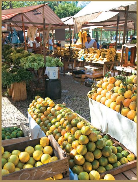 A stall with piles of oranges in the fruit market of Ipanema, Rio de Janeiro.