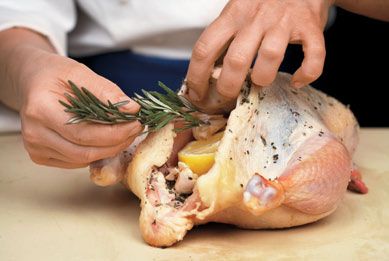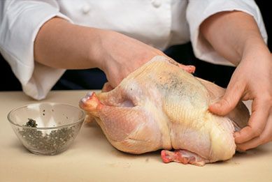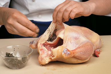 With your hand, gently separate the skin from the breast meat without tearing the skin, and spread the trito over the breast meat. Make incisions through the skin into the joint between thigh and drumstick; stuff the trito into the joints and under the skin of the legs.