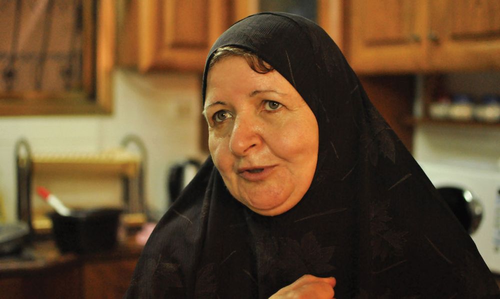 A large apartment block pockmarked with artillery fire towers incongruously over a dirt road and rubble-strewn lots. We climb the stairs to the apartment Um Imad (Khadra Abu Alees) shares with her daughter’s family. A gust of air-conditioning greets us as we enter, lush drapes and elegant furnishings contrasting sharply with the building’s stark exterior. Um Imad and her daughter bustle to make us feel welcome, the ingredients for sumagiyya already artfully arranged on the kitchen counter.
