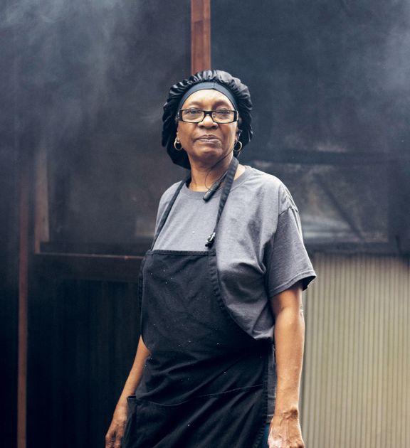 Helen’s ‘Bar-B-Que’ is operated from a 100-year-old dark red wood-panelled shed in the middle of a parking lot. She’s one of the few female pit-cooks in the country and by lunchtime trucks were whipping into the lot for her pulled pork and coleslaw, baloney sandwiches and beans. What looked like the smoking remnants of an arson attack was actually Helen’s pit room, built onto the back of the shed. The room was entirely filled with smoke; you couldn’t see 30cm (1ft) in front of you and we were all crying immediately, Helen with a little more composure.
