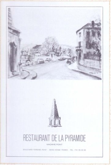 The menu at La Pyramide seems fresh and modern, though the majority of the dishes are still those created by Fernand Point, many of them forty years ago. Guy Thivard, the present chef, has, it is true, added a few of his own dishes, such as the assiette de maree, escalope de saumon Pyramide and aiguillettes de canard. But these would not have surprised Point; he would have found them very much in his style.
