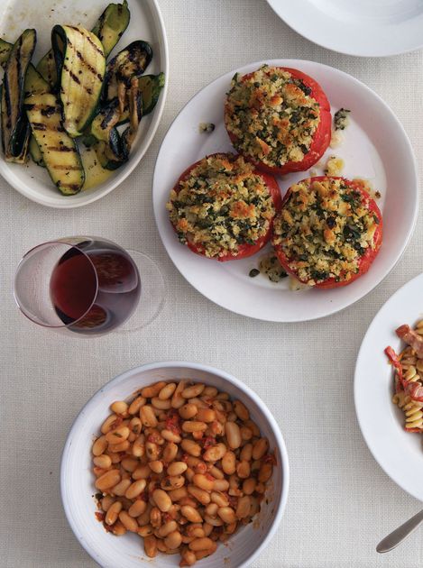 The classic Italian meal consists of several courses, none of which is considered a main course. A primo, or first course, can be a pasta, risotto, or soup. It is followed by a secondo, a second course that usually consists of meat, chicken, or fish, often accompanied by a vegetable. The secondo is followed by a salad, and then by fruit or dessert. A simple green salad is a part of almost every one of our family meals, and we like to serve it at the end as a refreshing palate cleanser. Some salads, such as the Tuna, Bean, and Red Onion Salad in this chapter, can also be a light meal or an appetizer. There’s also a “Russian” salad here, a typical holiday dish that has nothing to do with Russia except for the fact that it has beets in it; I remember my parents would almost always make it to celebrate the New Year.